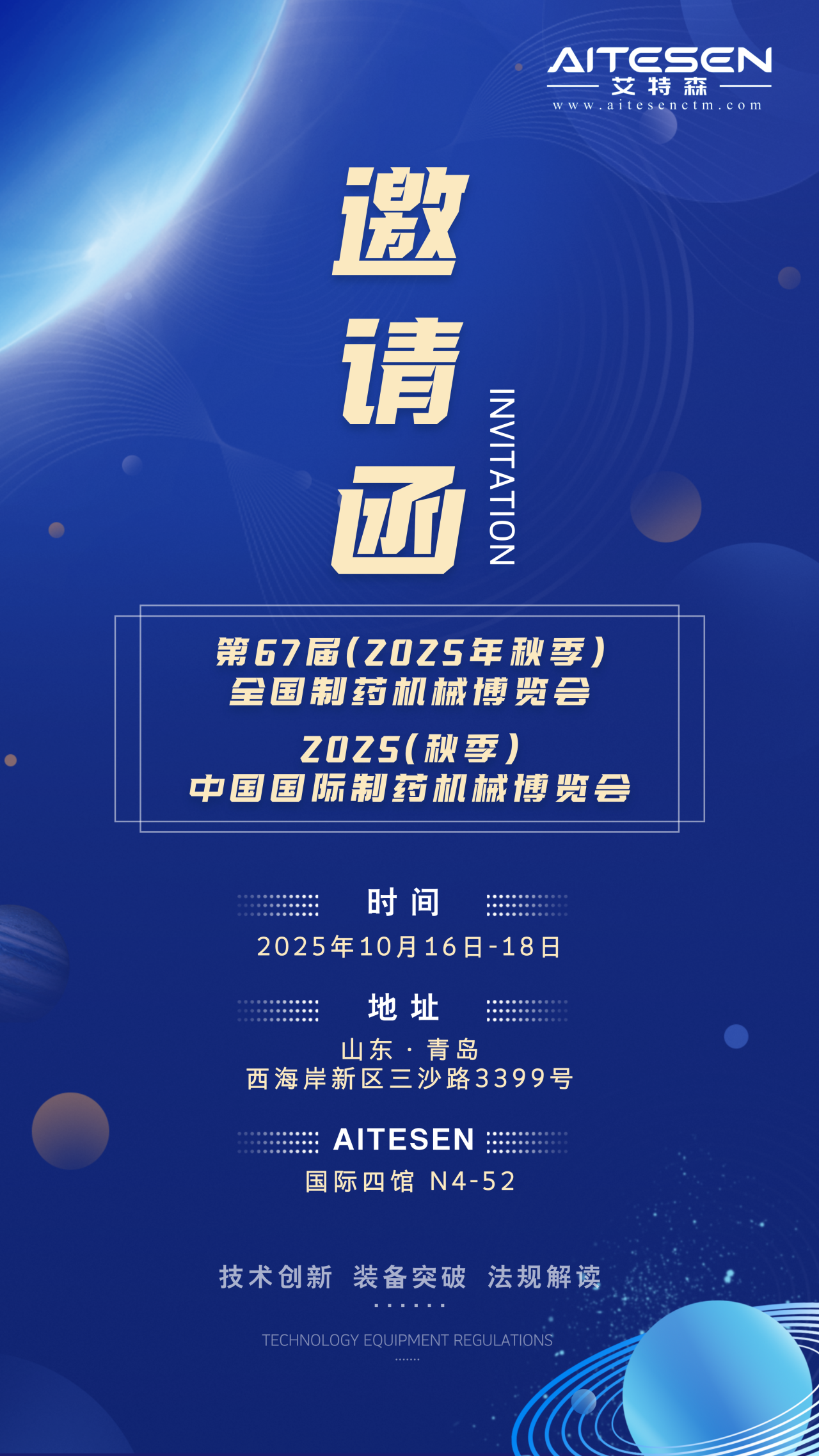 当前位置:首页 > 新闻资讯 > 【展会邀约】AITESEN邀您相约第67届(2025年秋季)全国制药机械博览会暨2025(秋季)中国国际制药机械博览会
