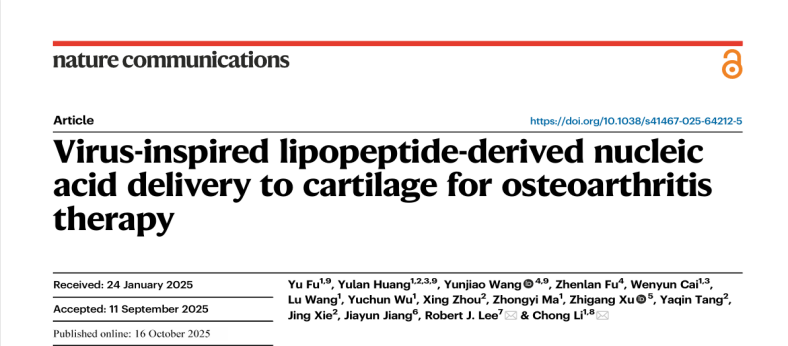 2025年10月16日,西南大学李翀教授、美国俄亥俄州立大学Robert J. Lee等合作者在期刊《Nature Communications》上发表题为"Virus-inspired lipopeptide-derived nucleic acid delivery to cartilage for osteoarthritis therapy"的研究论文。