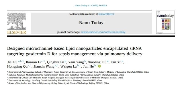 2025年1月30日 ,医药先进制造国家工程研究中心何军团队在《Nano Today》上发表了题为" Designed microchannel-based lipid nanoparticles encapsulated siRNA targeting gasdermin D for sepsis management via pulmonary delivery "的学术论文。