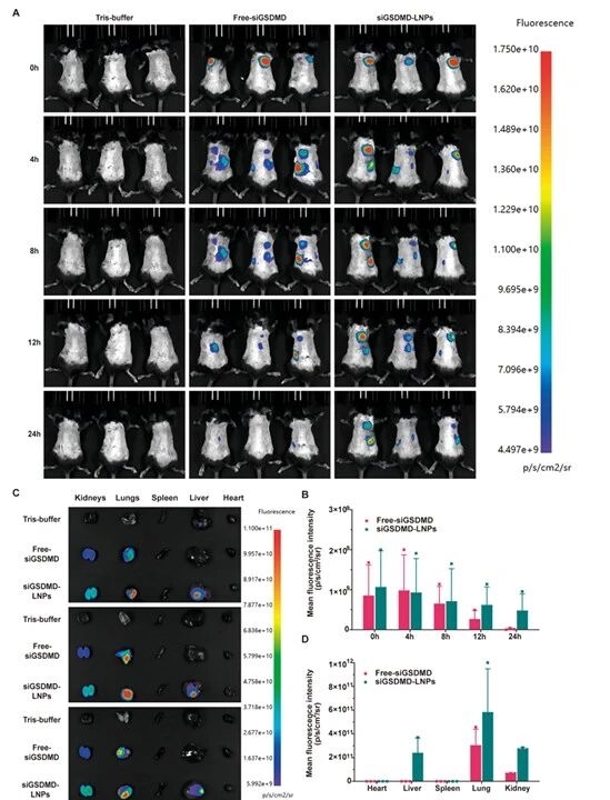 进一步地,研究团队通过活体和离体器官成像,发现LNPs经肺部递送后主要富集于肺组织,且滞留时间长于游离siRNA,明确其肺部靶向递送特征。
