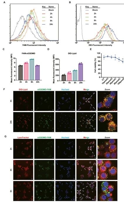 在确定siGSDMD-LNPs制备方案后,研究团队为验证该纳米粒的体内作用机制,通过检测不同时间点LNPs在骨髓来源巨噬细胞(BMDMs)内的摄取效率,验证出LNPs对细胞活力无显著影响的结论;观察到siRNA在6小时可从溶酶体释放至细胞质,证实LNPs具备高效细胞摄取和溶酶体逃逸能力。