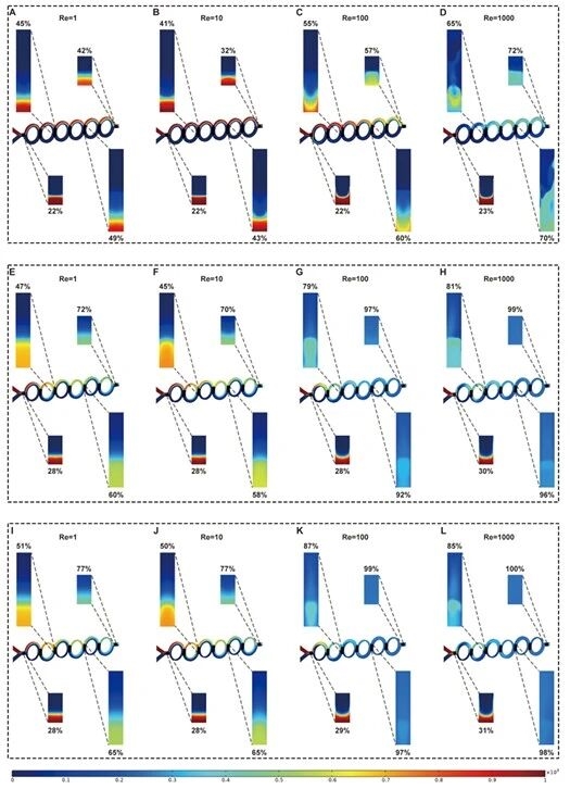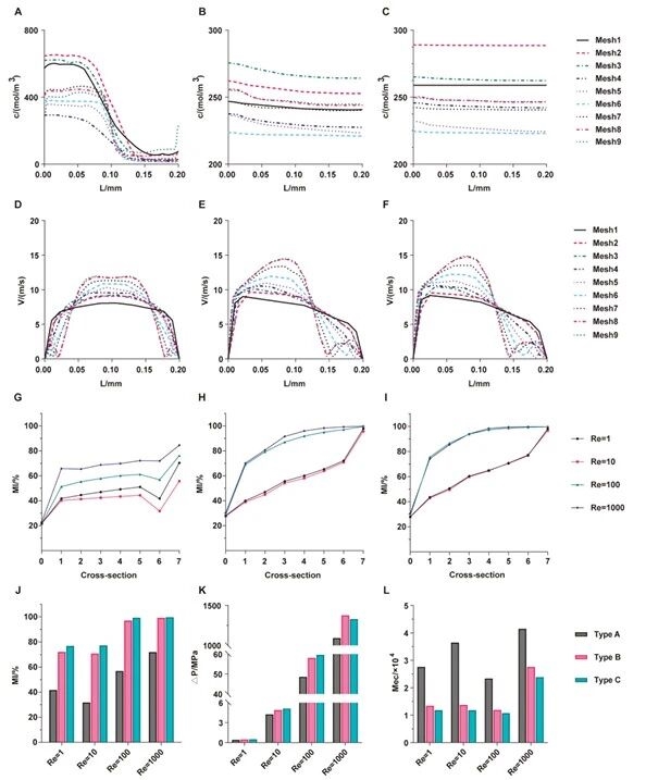 研究团队进一步通过验证不同网格精度下通道截面的浓度和流速分布,确定最优计算网格;对比三种微通道的混合指数、压力降和混合成本效率,明确Type C的混合成本效率最低,为后续实验提供理论支撑。