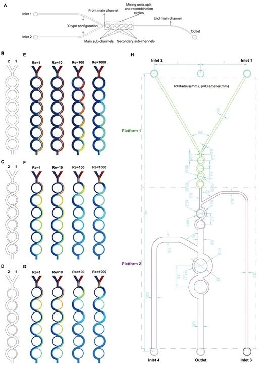 研究团队呈现三种主副通道宽度比(1:1、2:1、3:1)的微通道构型(Type A/B/C),模拟不同雷诺数下的流体混合状态,并展示CA/SAR/C1芯片的内部通道结构,为筛选高效混合微通道提供结构依据。
