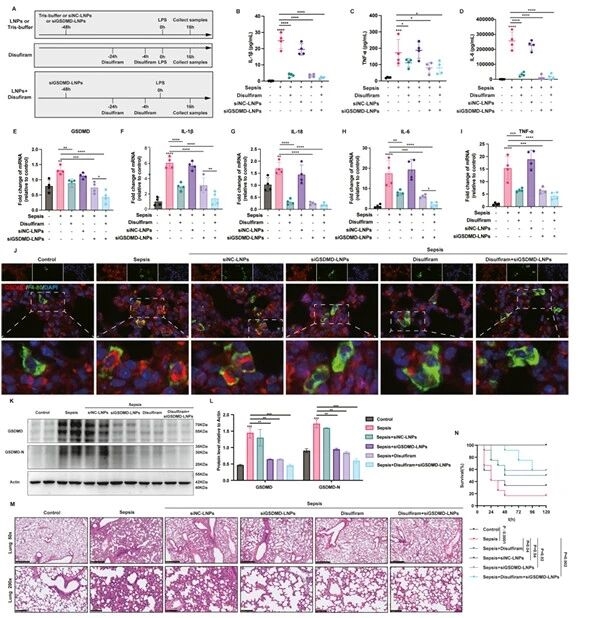 研究团队通过设计小鼠体内给药的实验方案,检测到脓毒症小鼠血浆炎症因子水平降低,肺组织GSDMD表达及炎症因子mRNA水平下调,肺组织病理损伤减轻;生存曲线证实siGSDMD-LNPs可显著提高脓毒症小鼠的生存率。