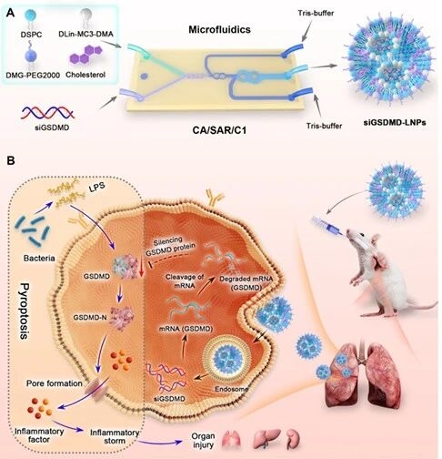 本研究通过优化微流控芯片设计制备出性能优异的siGSDMD-LNPs,经肺部递送后可靶向沉默的GSDMD,阻断焦亡通路,减轻脓毒症引发的多器官损伤,为脓毒症治疗提供了新策略。