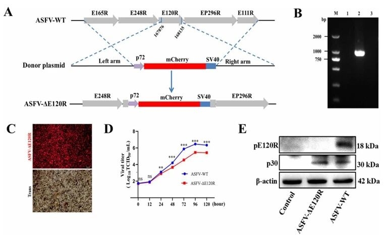 研究团队通过PCR、测序和Western blot证实E120R基因被成功敲除;生长曲线显示该缺失株在猪肺泡巨噬细胞中的复制能力显著低于野生株。