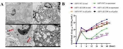 2 采研究发现ASFV-ΔE120R通过形成异常管状结构、显著降低病毒粒子释放能力实现完全减毒,且能更强激活宿主固有免疫(如上调趋化因子、干扰素刺激基因表达),同时在免疫猪体内无病毒排毒,解决传统减毒疫苗排毒及毒力返强的关键问题。