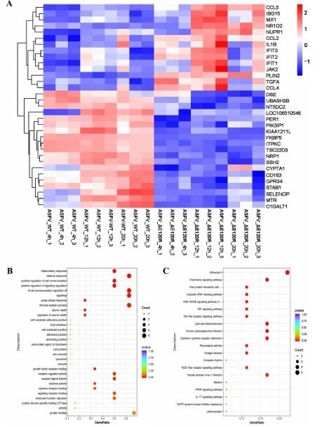 RNA测序热图显示,缺失株感染后趋化因子、干扰素刺激基因等抗病毒基因表达显著上调;GO和KEGG富集分析表明差异基因富集于固有免疫和炎症信号通路上。