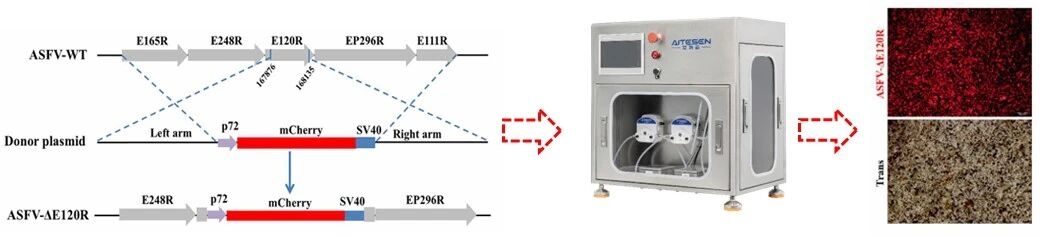 本次研究通过同源重组技术,用含p72启动子和mCherry的报告基因盒替换ASFV SY18的E120R基因,转染骨髓来源巨噬细胞(BMDMs)后,结合荧光筛选与有限稀释法分离重组病毒ASFV-ΔE120R,再经艾特森LDS-L2型超滤设备去除宿主细胞碎片纯化病毒。